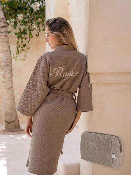 - Geniet van alledaagse luxe met onze Taupe Waffle Bundle, met een gewafelde badjas en een bijpassend compact tasje. Voeg een persoonlijk tintje toe met gepersonaliseerde borduursels voor een set die zowel attent als tijdloos is.