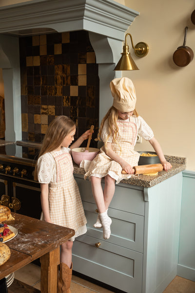 • Stijlvolle checker apron voor kids, gemaakt van 100% katoen – zacht, ademend en comfortabel voor elke dag. De tijdloze beige ruitprint met subtiele roze details geeft een speelse en charmante uitstraling. De gesmokte bovenzijde zorgt voor een fijne pasvorm, terwijl de losvallende onderkant volop bewegingsvrijheid biedt. Het haltermodel met striksluiting is eenvoudig verstelbaar. Personaliseer met naam of initialen, met zorg geborduurd in ons eigen atelier – perfect als uniek cadeau voor de kleintjes.
